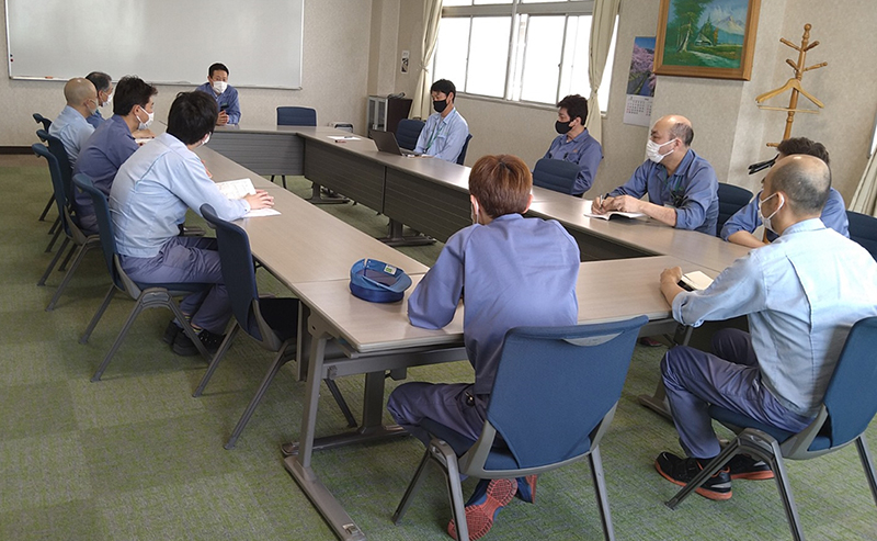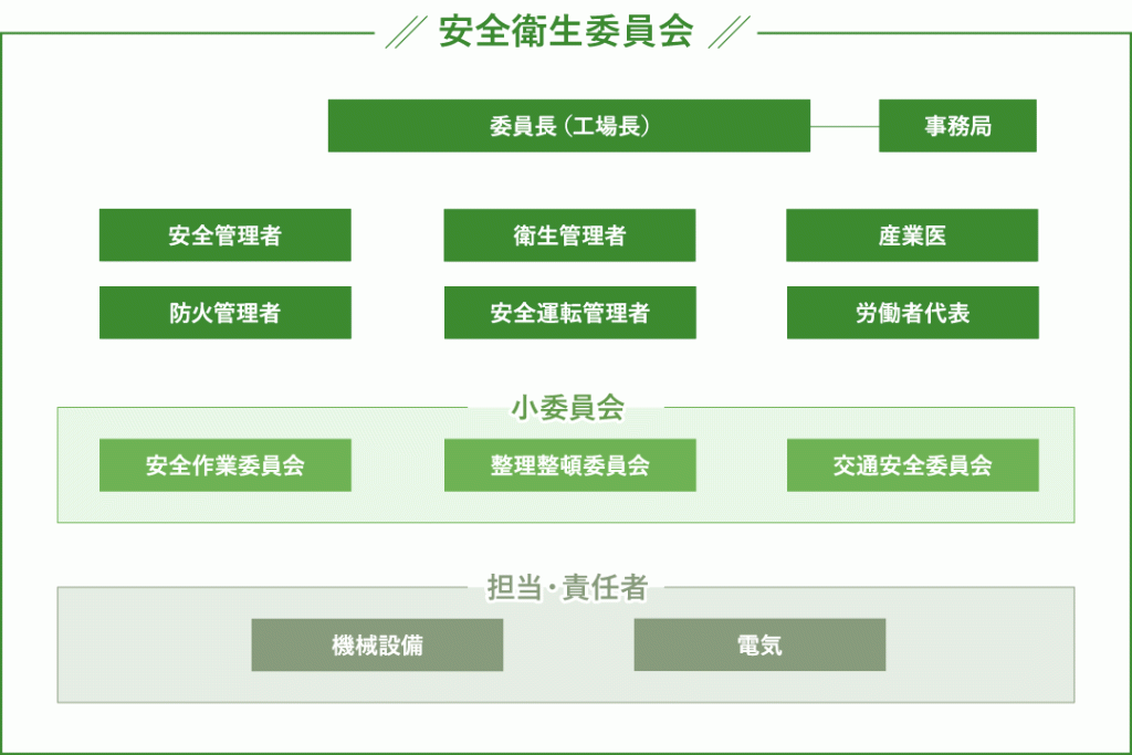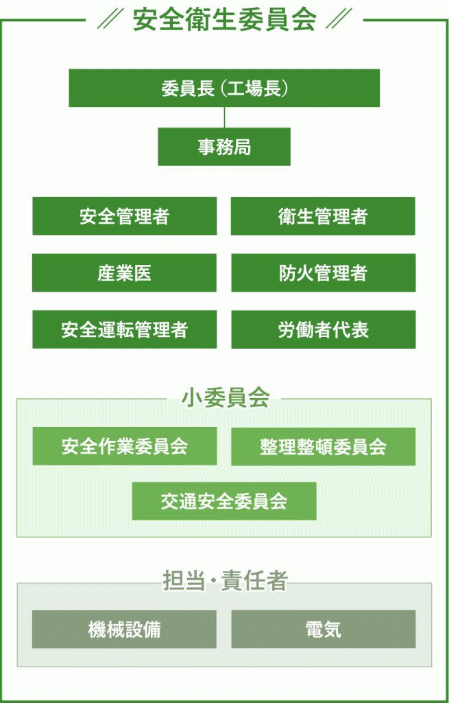 労働安全衛生法に定められた「安全衛生委員会」を全事業所で毎月実施しています。委員会では、労働災害や健康障害の防止策、健康増進、リスクアセスメントに関する事項等を調査、審議しています。その内容は速やかに事業所内で共有され、労働災害の防止等に役立てています。
