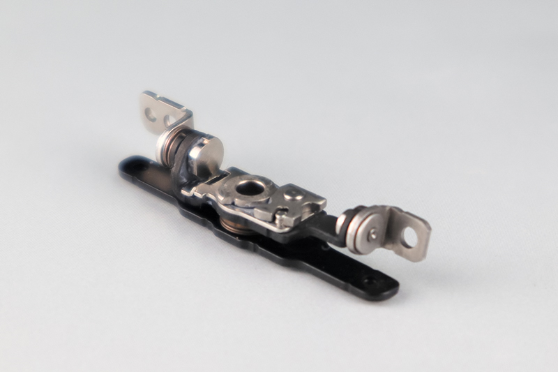 機構開発設計提案 採用事例 直交2軸ヒンジ 直交2軸ヒンジ 2つのヒンジを交差させて縦横の動作を可能にします。 自社でもつ精密プレスの加工技術を応用し小型化を実現しています。 中空軸を使用しハーネスの組込を可能としています。フレキ組込に対応したタイプもあります。 ニーズに合わせ設計から対応することができます。