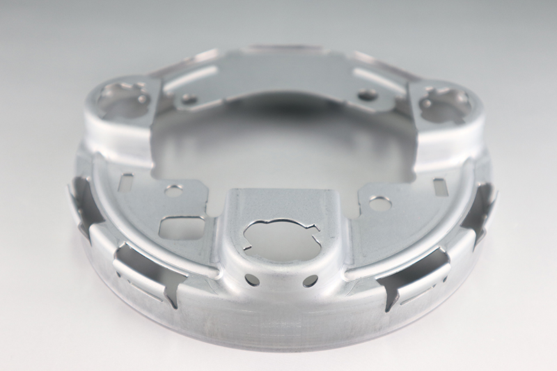プレス製品 ドライバーエアバッグ部品 ドライバーエアバッグ部品 順送型と単発型の固有技術の複合によりどちらかだけでは不可能な形状を実現。 金型製作前にプレス成型解析を活用することで最適な工程をシミュレートします。 単発型搬送ラインにより高い生産性を維持します。
